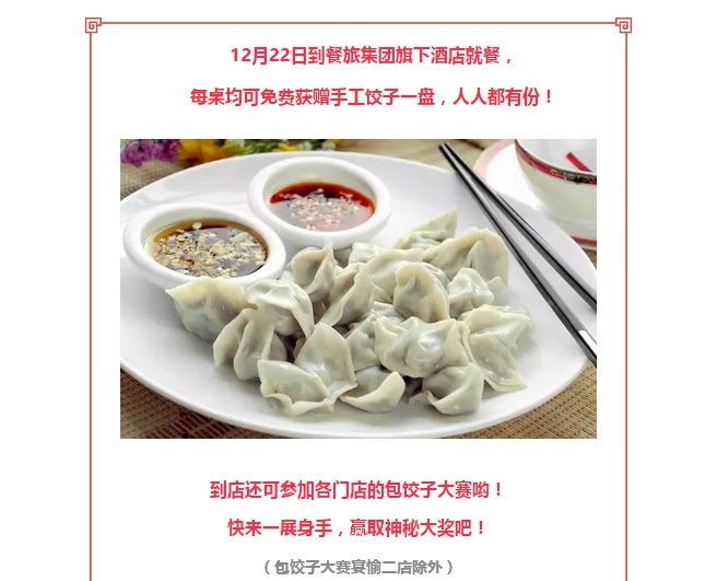 冬至 | 免费手工饺子!更有包饺子大赛赢神秘大奖! 发布时间:2017-12-21来源:点击:2652 洛阳餐旅 宴会专家全国预订客服热线:400-616-3939微信号:hacyly股票代码:836977长按二维码识别后添加关注以上信息来源于洛阳餐旅集团官网:www.hacyly.com 分享到:0 用手机看 拍下二维码,信息随身看 试试用微信扫一扫,在你手机上继续观看此页面。 上一篇:到宴愉洛邑古城店,精品美味天天免费吃! 下一篇:***影视演员李亚鹏参观洛阳旅发集团旗下华夏喜庆文化博物馆
